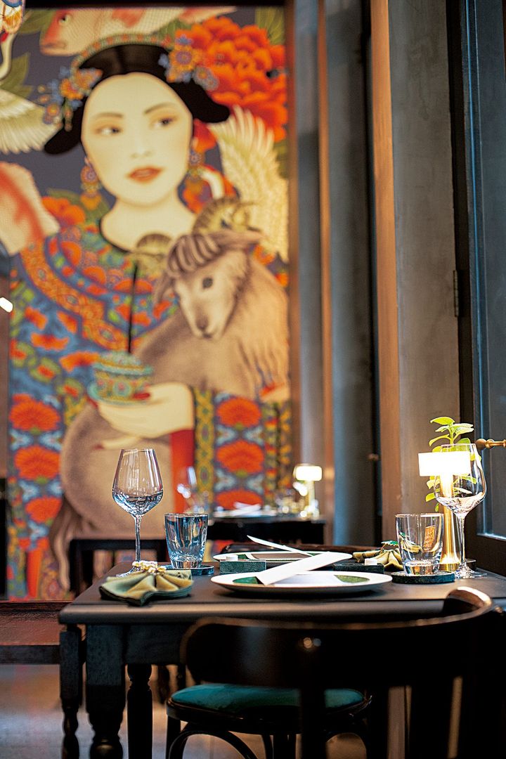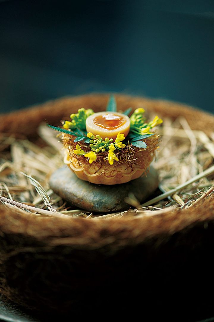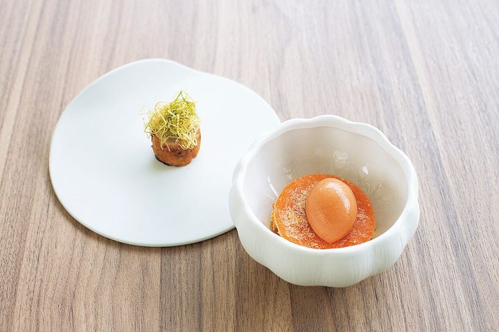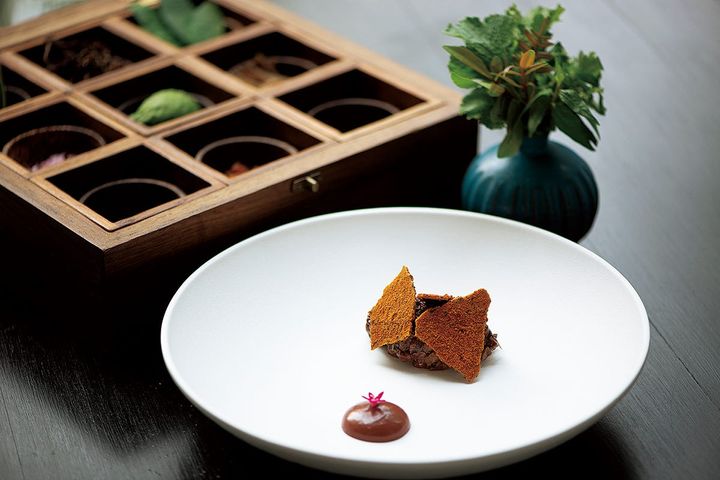 「店の中庭は農場のイメージで、大半は食用植物です。料理に使用するハーブはほぼ自家栽培ですし、バンコク郊外でマッシュルームを水耕栽培しています。未来的な農業の象徴です」。このバンコク産マッシュルームから始まるコースは旅行仕立てになっており、各地の特産品を生かした12皿ほどの料理で構成されています。「メニューは半年ごとに刷新し、出発地のバンコク以外は行き先も最終地点も毎回異なります」