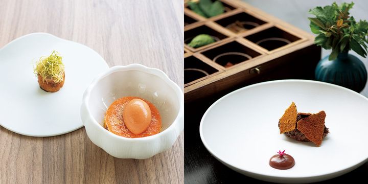 右はソースをソルベに仕立て、甘エビを使ったパパイヤサラダ、左は和牛とスティッキーライス。 Hearst Owned