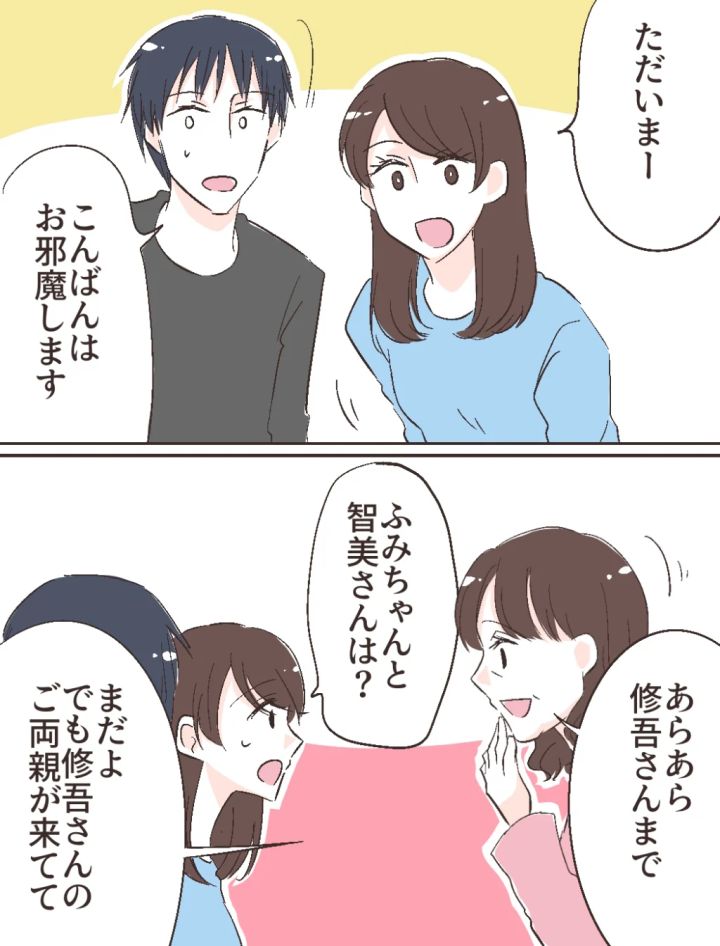 仕事終わりに修吾と合流した私は、彼を連れてそのまま家に帰りました。出迎えてくれた母に「ふみちゃんと智美さんは?」とたずねるも、2人はまだ戻っていない様子。その代わり、修吾のご両親が到着していると聞かされました。