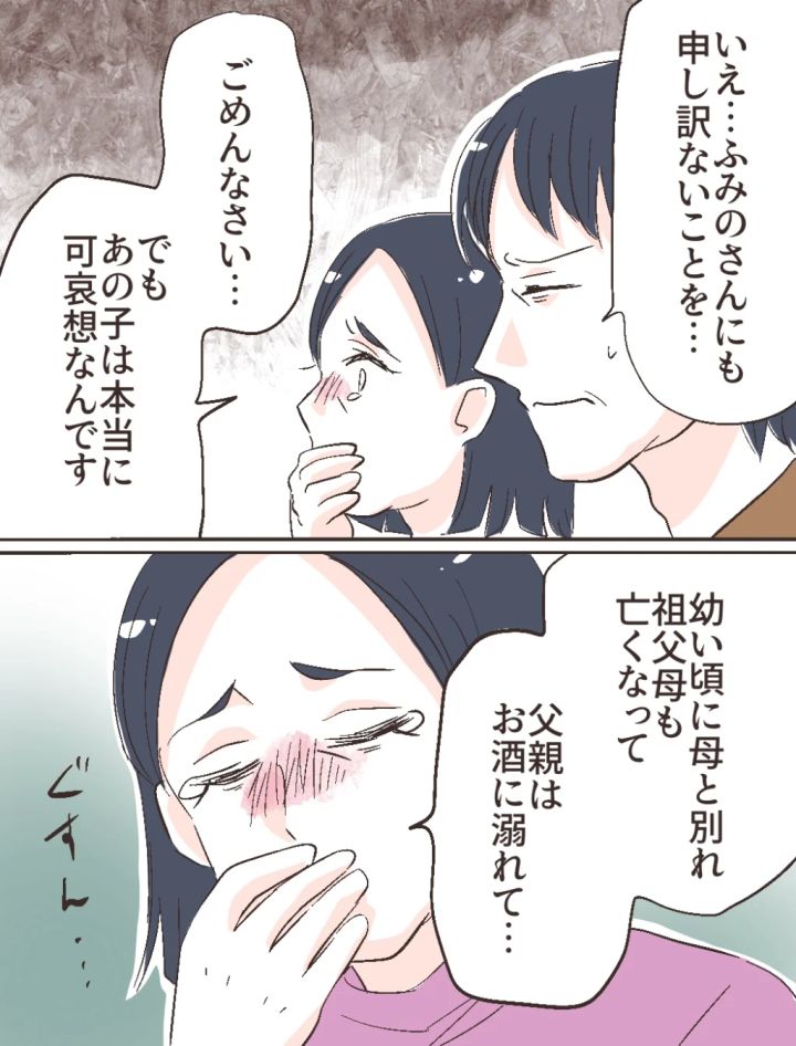 義父は力強く目を閉じると「いえ、ふみのさんにも申し訳ないことを」と謝罪しました。すると義母が目に涙を浮かべながら「ごめんなさい・・・でも、あの子は本当に可哀想なんです、幼い頃に母と別れ、祖父母も亡くなって、父親はお酒に溺れて」と、智美さんの境遇を語り始めました。