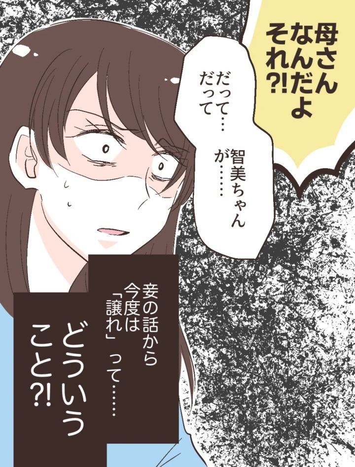 義母の言葉を聞いた修吾は「母さんなんだよそれ!?」と声を荒げます。妾の話から、今度は修吾を譲ってほしいだなんて、一体どういうことなのでしょうか。智美さんの生い立ちが気の毒なのは理解できますが、それとこれとは話が別です。あまりにも突飛な発言に、私は頭を打たれたような衝撃を受けました。