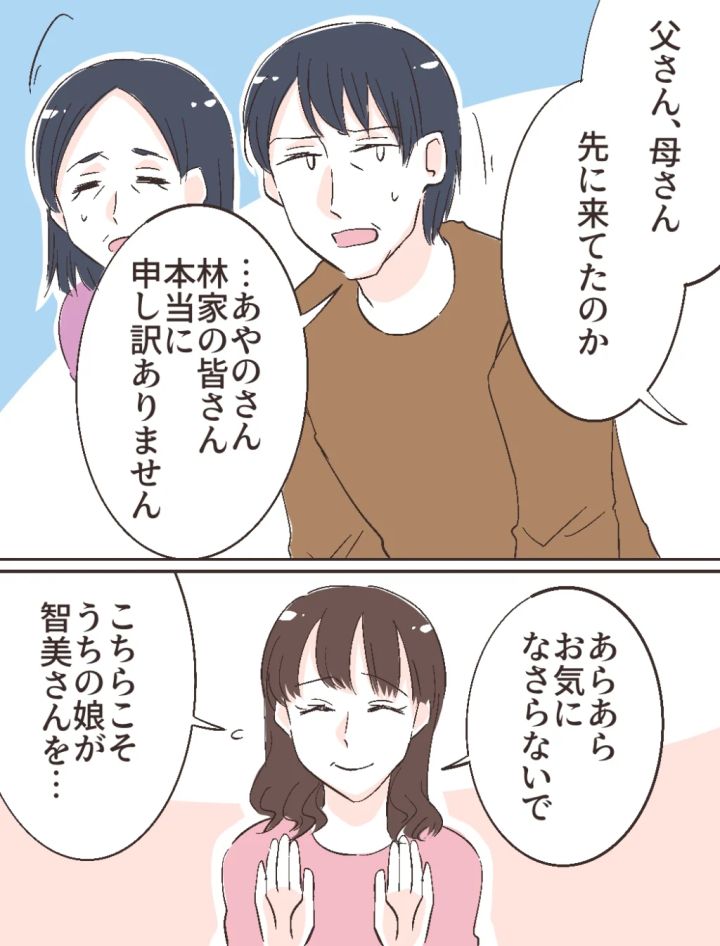 私に気づいた義父は、「あやのさん、林家の皆さん、本当に申し訳ありません」と義母とともに深く頭を下げました。すると母が「あらあら、お気になさらないで、こちらこそうちの娘が智美さんを・・・」と優しく応じます。