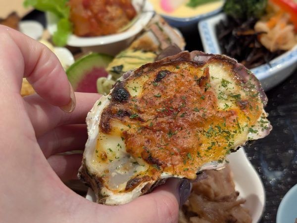 独特のほろ苦さが春を感じさせてくれます。 他にも筍の煮物やホタルイカの酢味噌和えも盛られていて、季節感じる一品もしっかりとありましたよ。 そして牡蠣を丸々1個使ったグラタン。