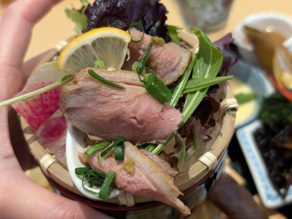 贅沢な肉料理の一つ、ローストビーフ♪ しっとりとしたローストビーフはピリッとわさびがきいたソースで大人な味。 大将が「ごはんもおかわりしてくださいね」と言ってくれましたがたっぷりなおかずでお腹大満足。