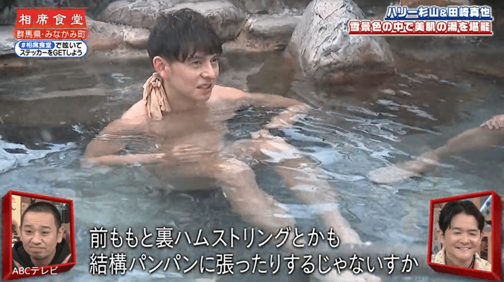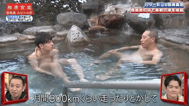 そんなハリーは、銀世界が広がる群馬県利根郡みなかみ町へ。みなかみ町といえば、関東屈指の温泉街だ。美肌の湯で有名な奥平温泉の遊神館にやってきたハリーは、スキー帰りの親子と露天風呂で相席。父親にハイテンションで、マラソンについてマシンガントークを繰り広げた。