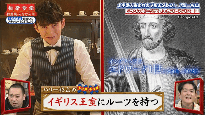 『相席食堂』に登場したイケメンタレントとは、ハリー杉山のこと。ハリーは、イギリス人の父と日本人の母を持ち、父方の先祖はなんとイングランド王だ。ペラペラの英語を活かして、リポーターやMC、ラジオDJだけでなく、マラソンランナーなど、マルチに活躍している。
