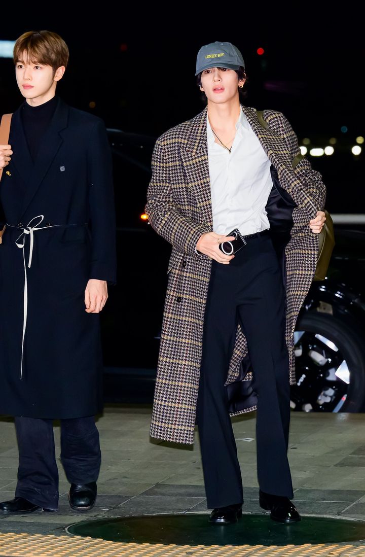 2025 MAMA AWARDSに出席するため、仁川国際空港から香港へと向かったこの日。サンローランのチェック柄のロングコートに“Y トート”バッグ、チェルシーブーツを合わせたクラシカルな装いに、ベントアイディア(BENT IDEA)のキャップでハズしを効かせて。