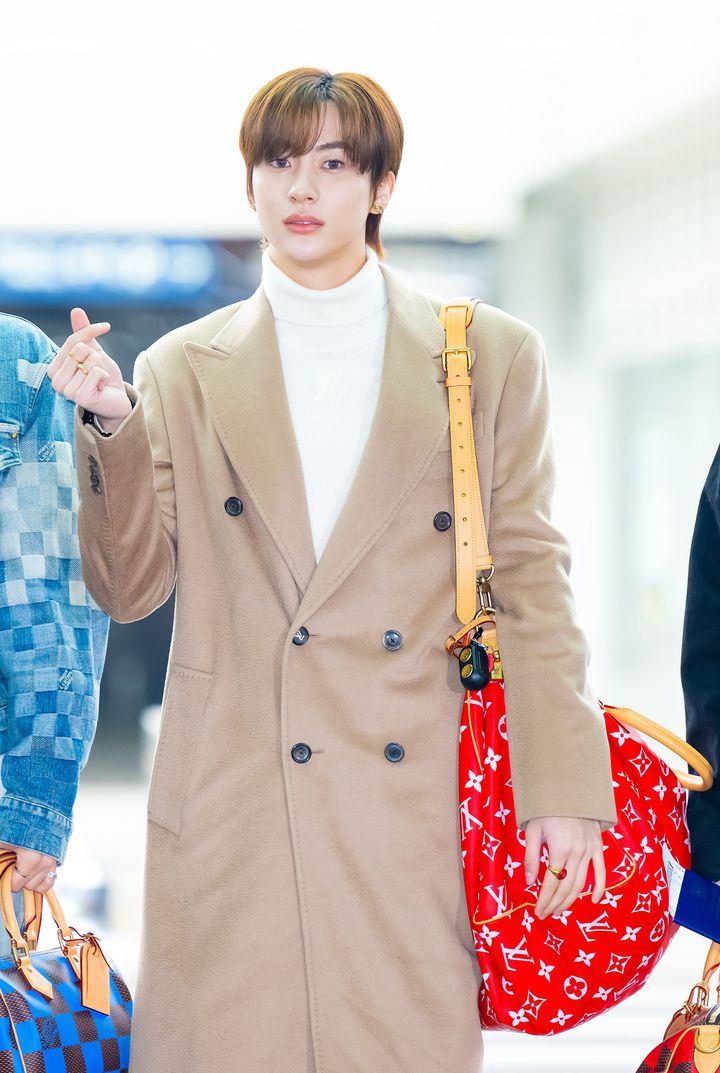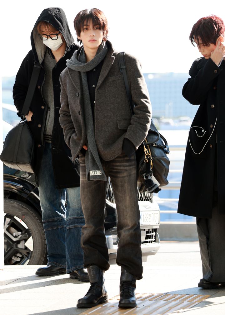 グループでブランドアンバサダーを務めるセター(SATUR)のコートとマフラーに、ルイ・ヴィトンのバッグをコーディネートし、ダークトーンで統一。メンバーのソンチャン(左)やショウタロウ(右)とともに、スマートなエアポートスタイルを披露した。