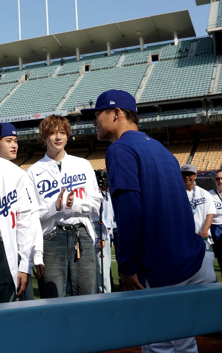 ロサンゼルス・ドジャース対アリゾナ・ダイヤモンドバックスの試合前に、ドジャー・スタジアムでパフォーマンスを行ったRIIZE。グラウンドで練習する山本由伸投手(右)と交流する姿も。