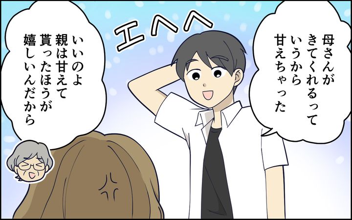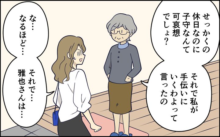 大人になっても母親のご機嫌をとろうとする夫はいわゆるマザコン息子。義母が遊びに来る日、妻が義母好みの和菓子を用意しておいたのだが、義母が喜ぶ顔を見た夫はまるで自分が買ってきたかのようにドヤってみせた。そんなある日、夫に子守りをお願いして美容室へと出かけた妻だが、帰宅すると…。