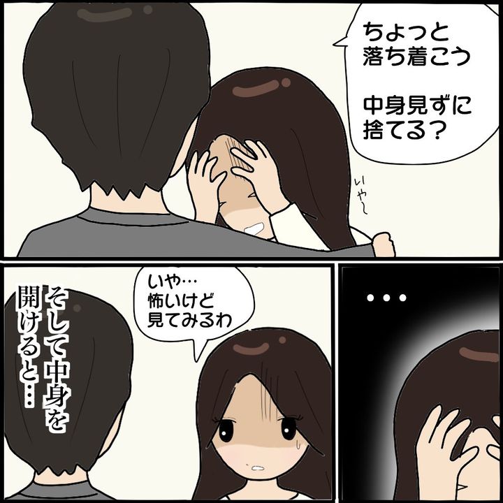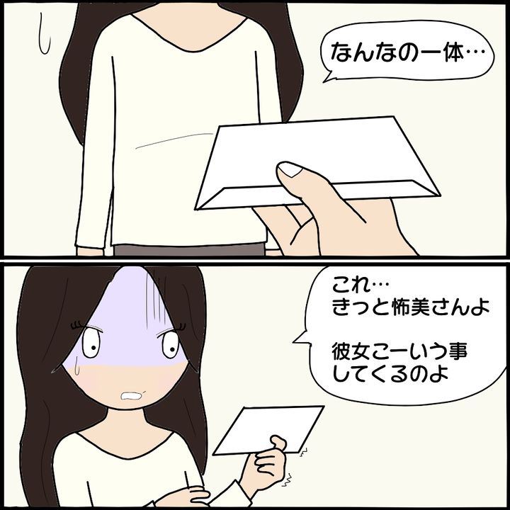 帰宅時にアパートの前で女性を見かけるようになったと話すK代の夫。嫌な予感がしたK代が怖美の写真を見せると、夫が見かけた女性と一致。何をするかわからないため警戒しながら過ごしていると、ある日郵便ポストに差出人不明の手紙が入っていて…。