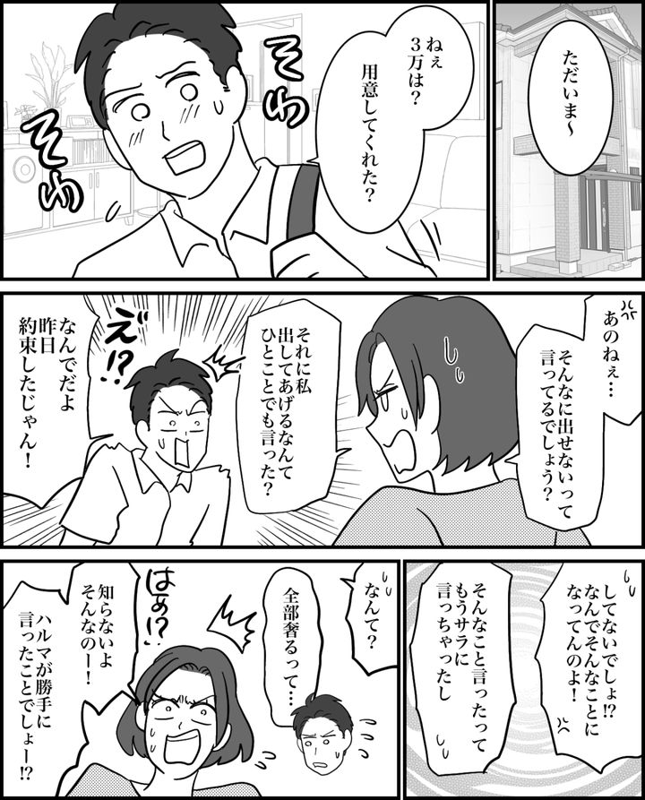 彼女にテーマパーク代を奢ってあげるために、3万円を要求してきたハルマ。当たり前のように私に出させようとするので、激怒したら逆ギレされました。その後はお互い激しく言い争うだけで、どうにもならなくなってしまったのです。