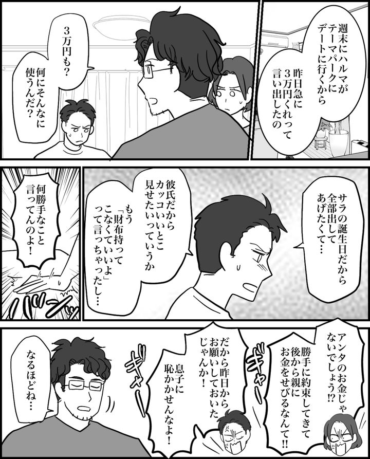 私はエリナ。夫のナオト、高1の息子ハルマと家族3人で暮らしています。最近ハルマにはサラちゃんという同級生の彼女ができました。しかし初めての彼女に舞い上がっているハルマは、彼女の誕生日祝いにテーマパークへ行くと言ってお金を要求してきました。その額、なんと3万円! 自分にかかるお金は全部、親が払って当然と思っているのです。とはいえ要求をはねつけたら、友達に借りたりしそうな勢いです。私は頭を悩ませていました。