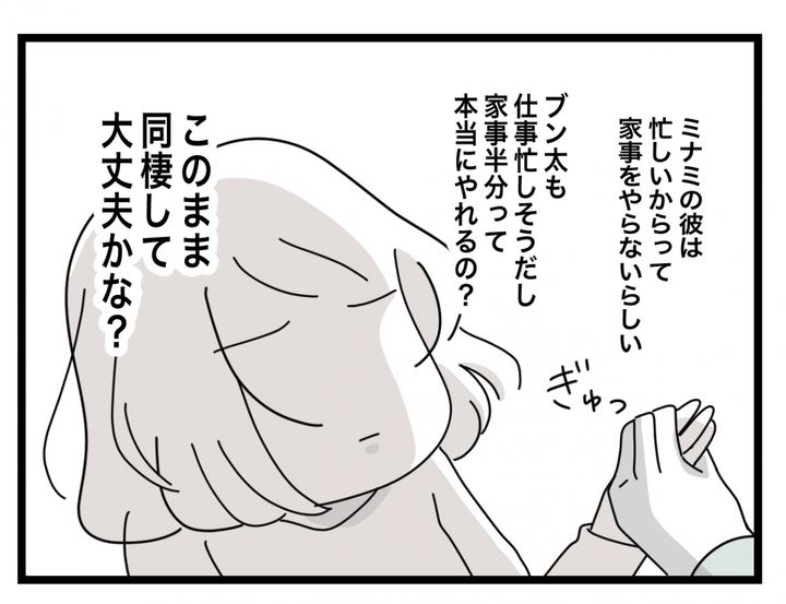 ツムママさんが複数の人の実体験をギュッと凝縮しフィクションとして描いた『半分夫』。1年前、長く交際してきたブン太は、マチ子に結婚を前提に同棲しようと提案した。ブン太が決めた同棲のルールは、家事も生活費も完全に折半するということ。収入がブン太より低いマチ子には少しキツくて困惑するが…。