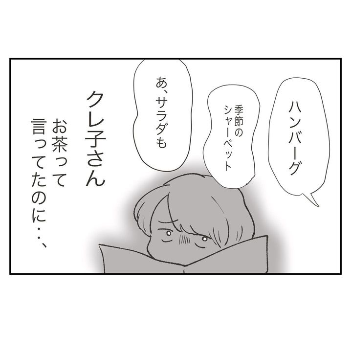 お茶って言ったのにガッツリ食事もデザートも頼むクレ子。その姿を見て、金銭感覚が違い過ぎてママ友になるのは難しいかも…と思ったカモ田さん。しかし、その後クレ子に心を掴まれてしまいます。