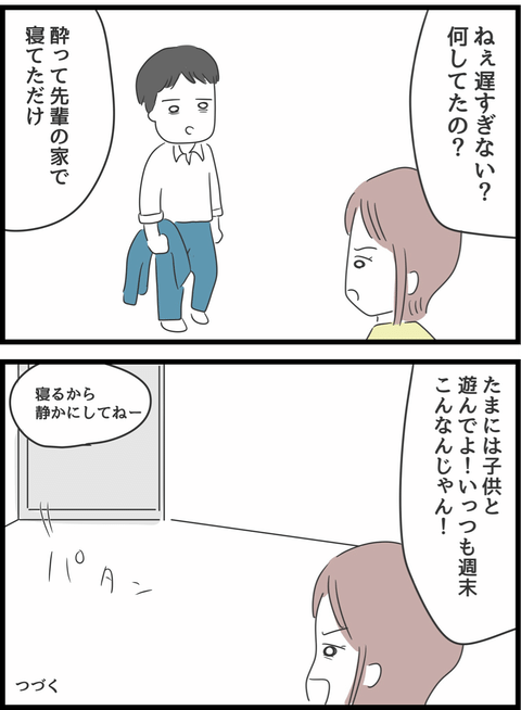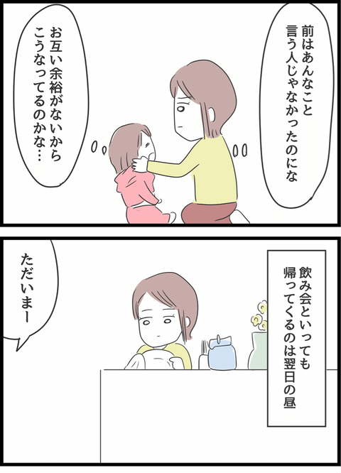 夫を嫌いになれず、一度目の浮気を許したあけみ。しばらくは夫も育児に協力的になり、平和な暮らしが続いたのですが…しだいに夫は飲み会に出かける頻度が増え、妻への態度も変化していくのでした。