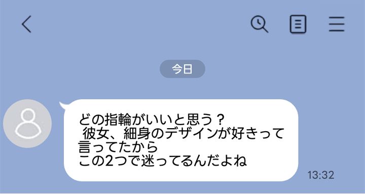 「どの指輪がいいと思う? 彼女、細身のデザインが好きって言ってたから、この2つで迷ってるんだよね」