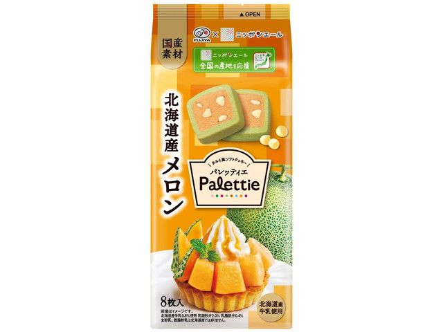 ・北海道産メロン果汁と国産米粉、ホワイトチョコチップを練り込んだしっとり生地に、北海道産牛乳を使用したサクホロ生地を組み合わせたソフトクッキー ・彩りあざやかなオレンジ色のクッキーで赤肉メロンのタルトをイメージ