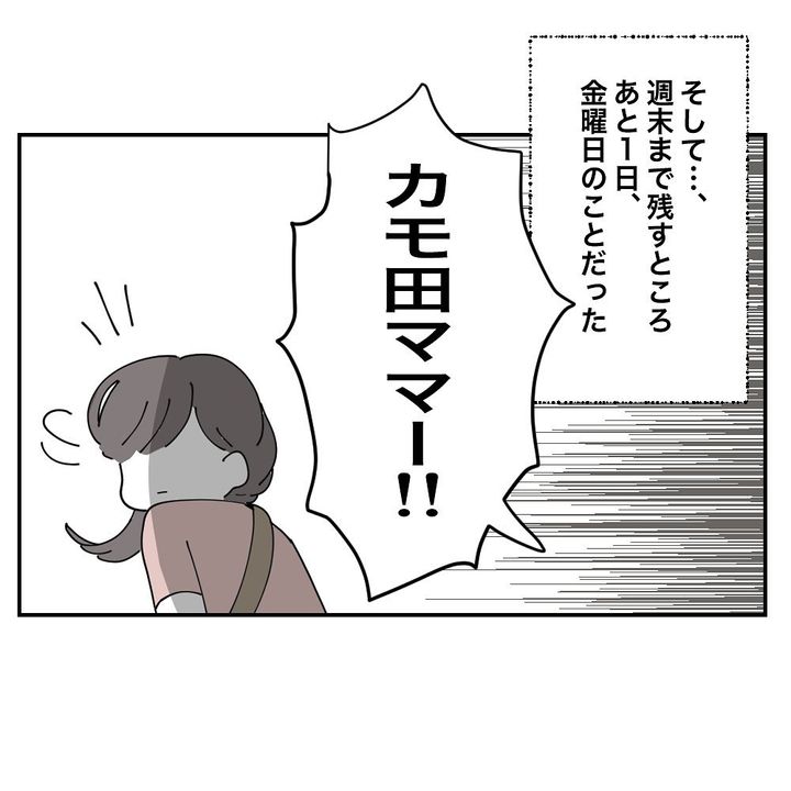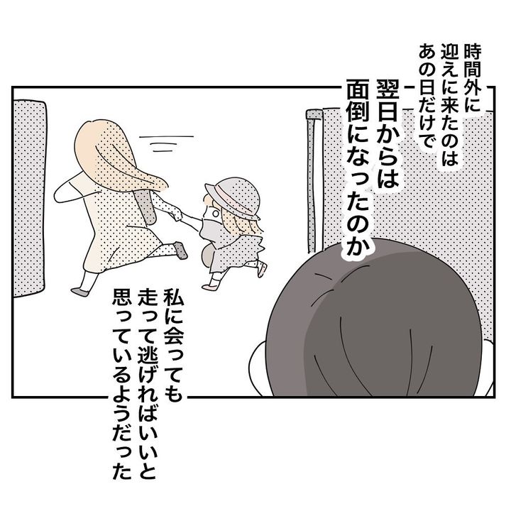 クレ子宅の玄関先で揉めた日は、時間外にお迎えに行ったりとカモ田さんと顔を合わさないように避け続けたクレ子でしたが、翌日には面倒になったのかいつも通りの時間に来て、目が合うと走って逃げるように。