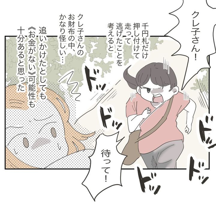 お茶を断られ逆ギレしたクレ子。それでもお金を返してと言ってくるカモ田にさらなる怒りを募らせたクレ子は、一方的に千円を押し付けると、そのまま走り去ったのでした。