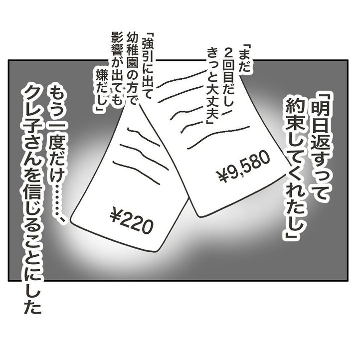 「最初から奢らせるつもりだった…?」とどうしても疑ってしまうけど、必ず返すと言うクレ子の言葉を信じてまたレシートを渡したカモ田さん。