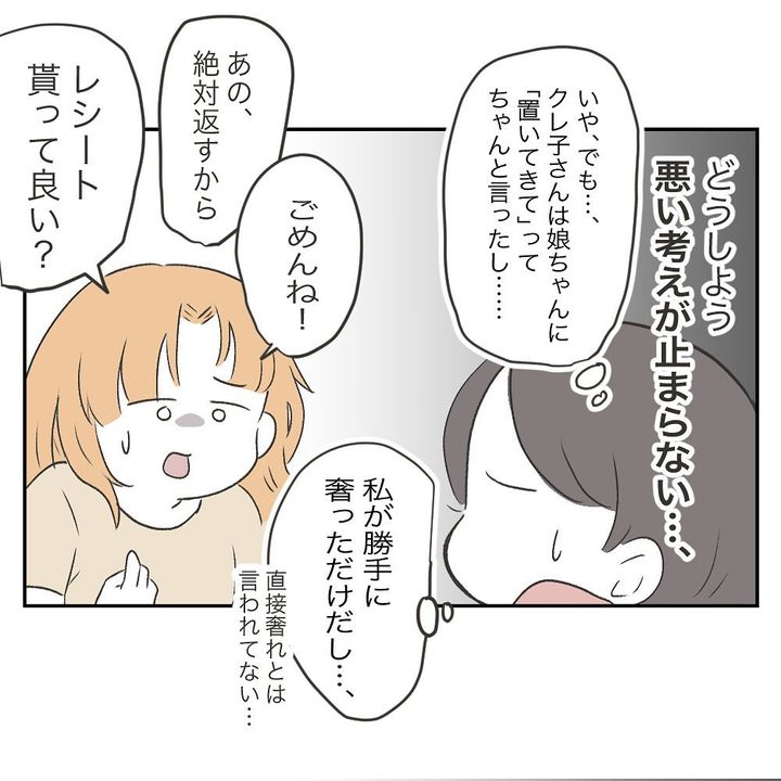 喉が渇いたとぐずりだした子どもたち。するとクレ子は「我慢させるのはかわいそう」とコンビニへ誘導。財布がないので自分の娘にはジュースを我慢させることになるとわかっていたはずなのに…。
