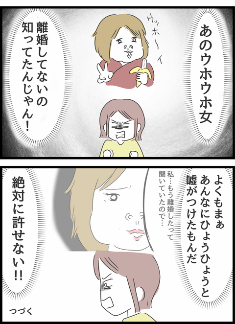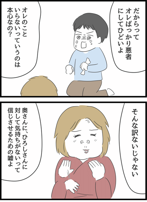 あの日、こもっていたトイレから出てきた夫は、浮気相手の裏切りに大号泣。実は浮気相手には離婚をしたと嘘をついていたことを謝罪し、真実を伝えていたのです。しかし浮気相手は自らの保身を堂々と語るのでした。