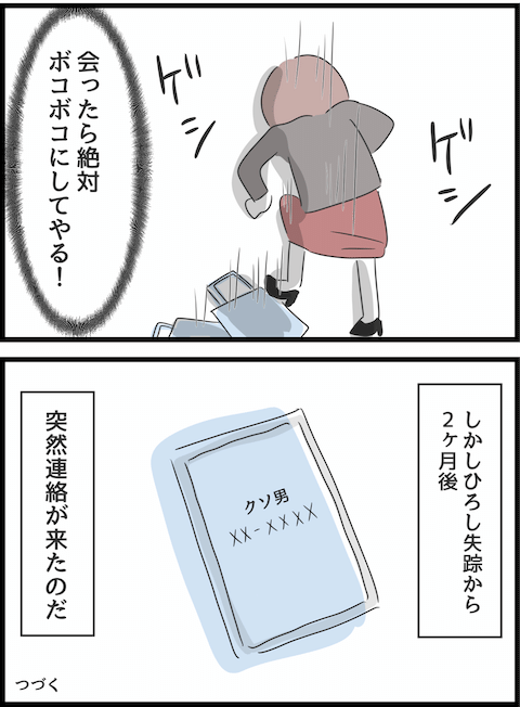 夫とはその後も連絡がとれず、会社に連絡しても数日前から出社していないとのこと。そして1ヶ月が過ぎた頃、退職の手続きをしてほしいと会社から連絡が入るのでした。