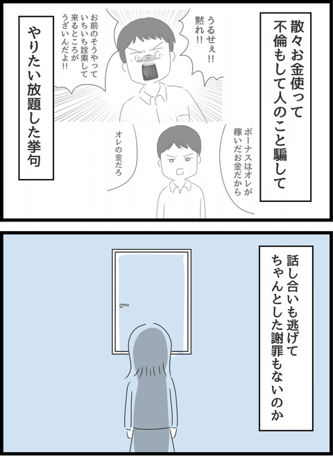 浮気夫に愛想をつかせたあけみと浮気相手。双方ともに夫を押し付け合います。その姿に逆ギレした夫に、あけみが「慰謝料」をちらつかせると叫びだしました。