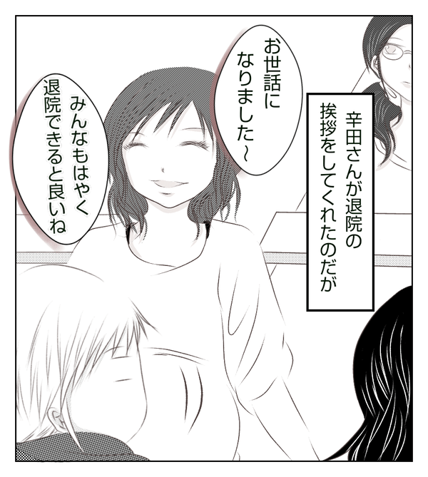 自宅安静時に大量出血があり入院となったという辛い過去を話してくれた美山。健診後、部屋に戻ると、上機嫌の辛田がいて…。