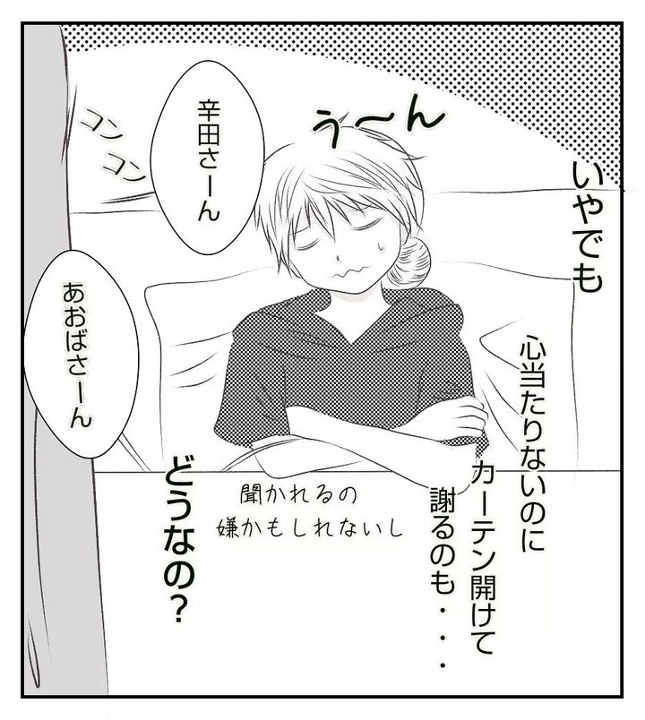 ちぃが退院した翌日から、突然あおばに対する態度が変わった辛田。挨拶したら何も言わずにカーテンを閉められてしまったのです。