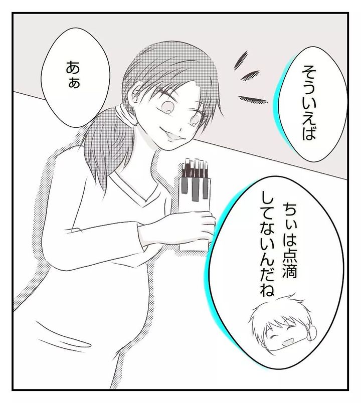 切迫早産での入院中は、常に点滴とともに行動することに。薬の副作用や点滴の不自由さ、毎日細かく体調記録をつけたり…と大変なことも多いが、「赤ちゃん元気ですよ」の言葉を聞くと嬉しくなるのでした。