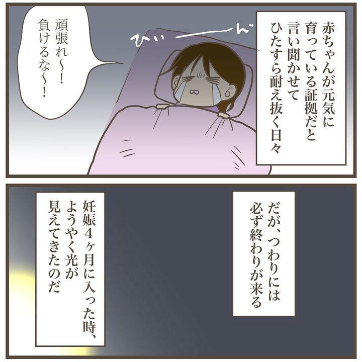 チワワから豆しば、豆しばからゴールデンレトリーバーへと成長し、最後はチベタンマスティフレベルにまで成長し荒れ狂ったつわり…。しかし、そんなつらい日々にもようやく終わりの兆しが見えてきたのです。