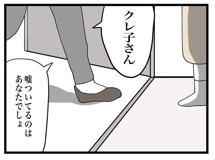 嘘でその場を誤魔化そうとするクレ子。自分の一言でクレ子夫婦が離婚するかもしれない…、事実を話すべきか迷っていると夫から喝を入れられ…。