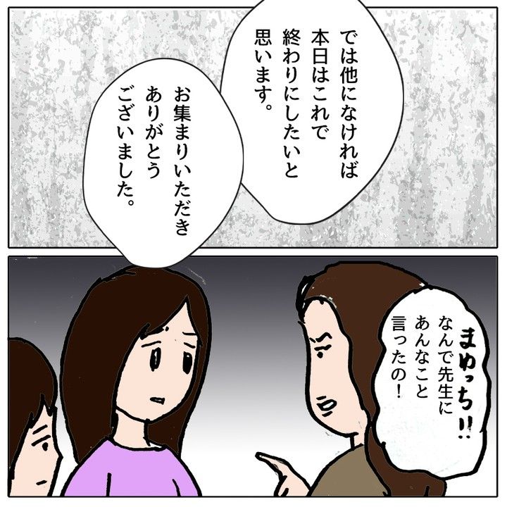 このままでは安心して子どもたちを学校に通わせることができない…懇談会で先生に対策をお願いしたまゆみさんをにらみつけたよしえさん。