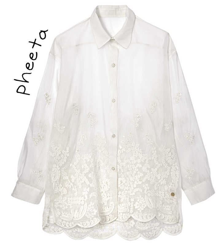 “繋ぐ”をコンセプトに、世界中の継承すべき希少な技術を大切に、引き継がれるような服を生み出す「フィータ」。シアーシャツは裾から上に向かって温もりある刺繍が施され、情緒たっぷり。