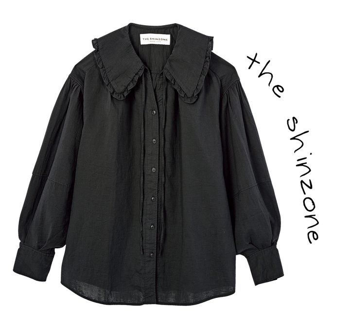 大きめな襟に小さなフリルが愛らしいリラックスシャツ。主役級の存在感ある襟をジャケットやスエットから覗かせて。