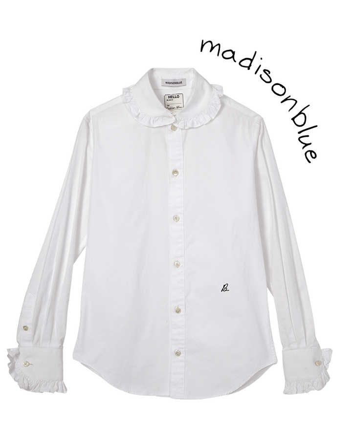 襟や袖口にフリルがあしらわれたシャツは、ブランドの頭文字Bの刺繍がアクセント。ニットを重ねフレンチプレッピーに着ても素敵。