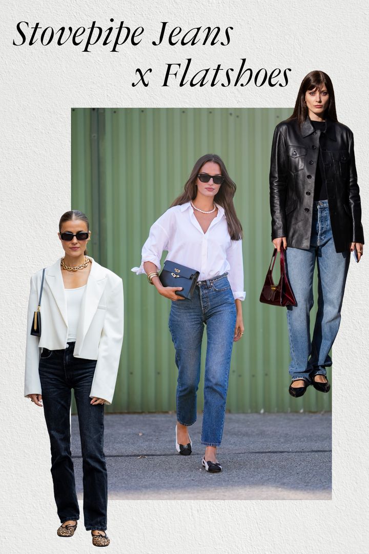 ストレートに近いシルエットのストーブパイプデニムには、あえてフラットシューズを合わせて抜け感をプラス。すっきりとしたラインをそのまま生かすことで、気負わないバランスに仕上がる。シャツをタックインしたり、ジャケットで上半身にシャープな要素を加えたりすると、フラットシューズでもラフに見えない。足元で主張しすぎず、全体のシルエットで魅せるのがポイント。