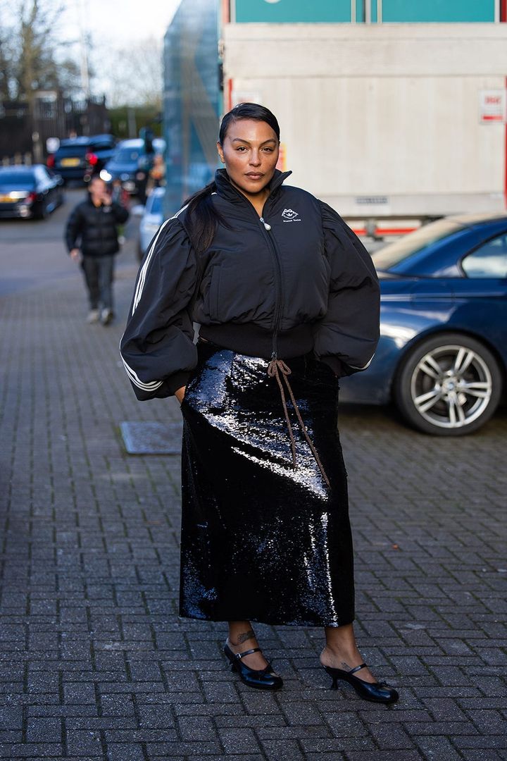 ボディラインに沿うきらびやかなペンシルスカートに、スポーティーなブルゾンをミックス。華やかさを程よくカジュアルダウンした、今季らしい着こなしに。