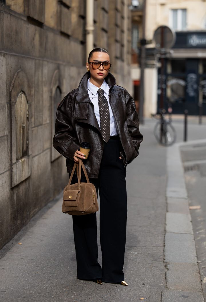 オーバーサイズのブラウンレザージャケットに、シャツとネクタイを合わせたマスキュリンなスタイリング。重厚感のあるレザーも、クラシックなアイテムと掛け合わせることでクリーンな印象に。