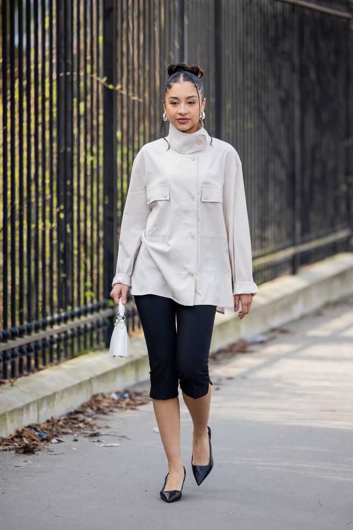 柔らかなトーンのファネルネックジャケットに、カプリパンツを合わせてクリーンにまとめたスタイリング。ポインテッドトゥで足元を引き締めることで、全体をすっきりと洗練された印象に。