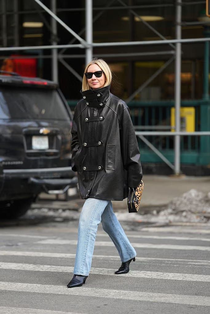 レオパード柄のジャケットをストレートデニムでカジュアルダウン。モノトーンに近い落ち着いた配色のため、柄も派手に見えすぎず取り入れやすい印象に。足元はポインテッドトゥでシャープに引き締め、全体をすっきりとまとめている。