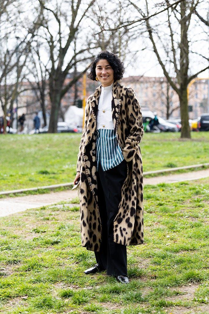 存在感たっぷりのレオパード柄のコートを主役にコーディネート。ウエストに覗くストライプシャツがアクセントとなり、さりげなく差をつけて。柄同士を掛け合わせながらも、全体は落ち着いた配色で統一し、品のある印象に。