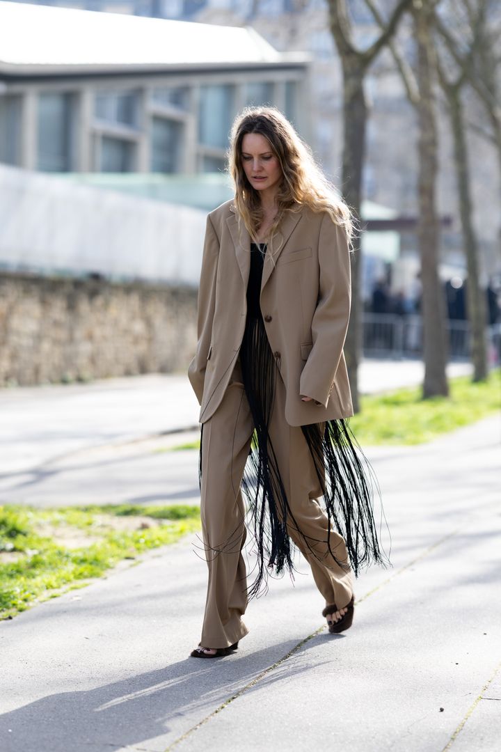 テーラードジャケット×ワイドパンツのクリーンなセットアップに、インナーでフリンジを効かせた着こなし。ベーシックなアイテム同士の組み合わせに、さりげない遊びをオン。