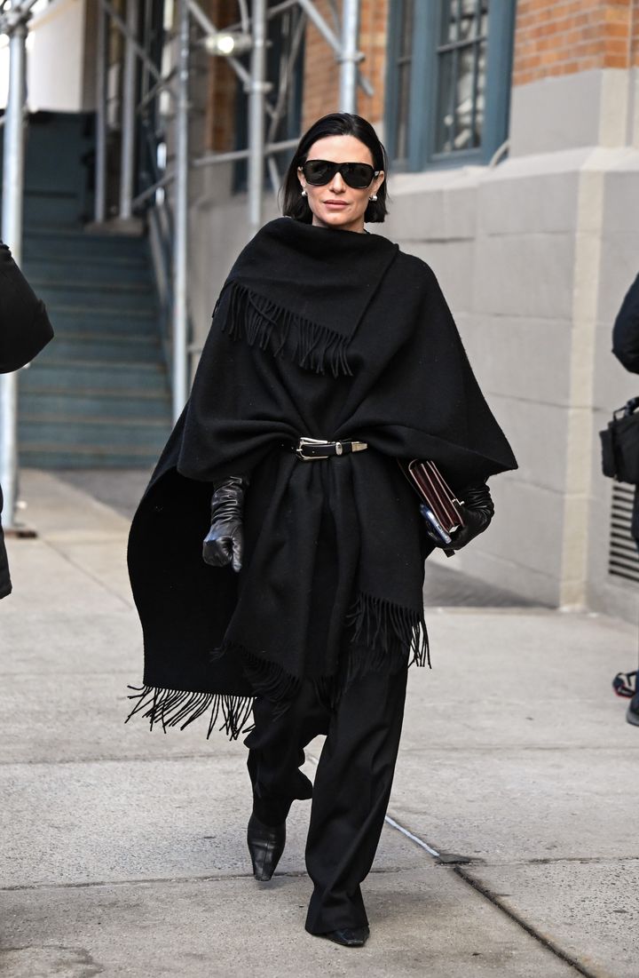 ポンチョに施されたフリンジが、ミニマルなオールブラックに動きをプラス。ボリューム感のあるシルエットも、ウエストマークで引き締めることでまとまりのある印象に。