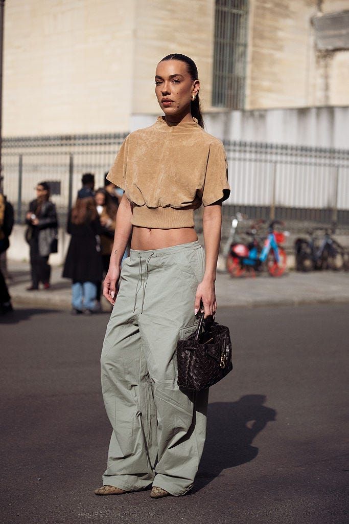 ローウエストパンツには、コンパクトなトップスを合わせると失敗知らず。ナイロンのボトムにスエード調のトップスを合わせることで、カジュアルに寄りすぎないように調整。さらに「ボッテガ・ヴェネタ」のバッグでリュクスにフィニッシュ。