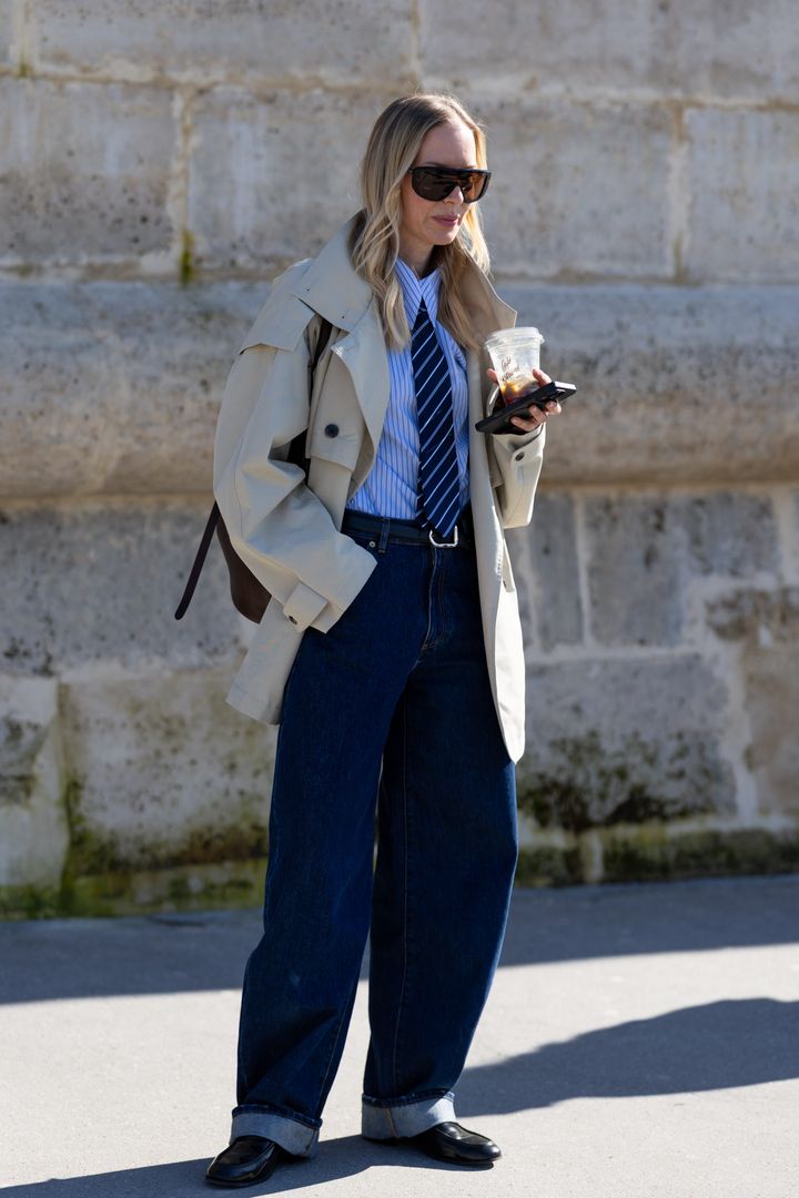 ストライプシャツにネクタイを合わせたトラッドな装いに、ワイドデニムで抜けを加えたスタイリング。オーバーサイズのトレンチコートが全体にゆとりを生み、かっちりしすぎないムードを演出。