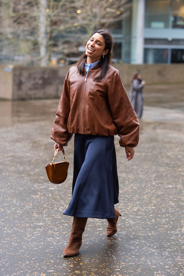ブラウンレザーのジャケットで、レザー特有のハードさをほどよく中和。ボリュームのあるシルエットに対して、落ち感のあるスカートを合わせてフェミニンに。バッグとブーツもブラウンでそろえ、スタイリングに統一感をプラス。