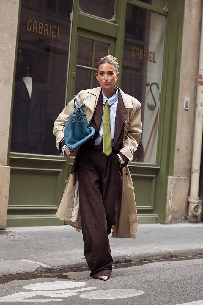 ブラウンのセットアップにトレンチを重ねた重厚なトーンのスタイルに、差し色としてネクタイでグリーンをON。さらにブルーのバッグを効かせることで、リズムをもたらした。